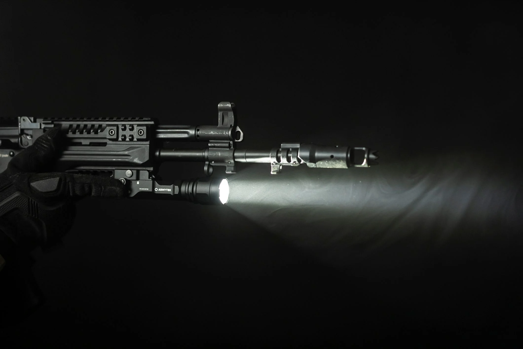 Dwa tryby jasności stałego białego światła do oświetlania i wstępnego celowania za pomocą plamki świetlnej, tryb Strobe do dezorientacji przeciwnika. Szybki dostęp do trybu Strobe bez dodatkowych przełączników.