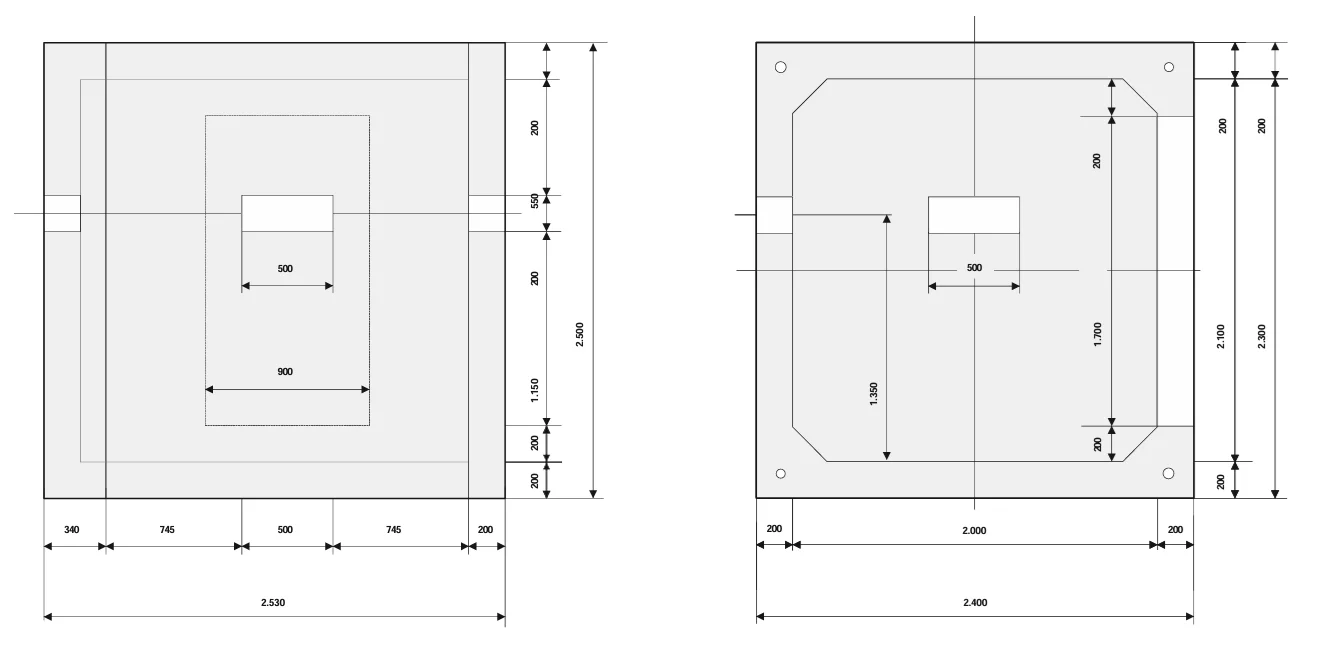 II. Dł. = 2 m, szer.*wys. = 3*3 m, całkowita szerokość*wysokość 3,4*3,4 m, grubość ścianki 0,2 m, waga 12,9 t.