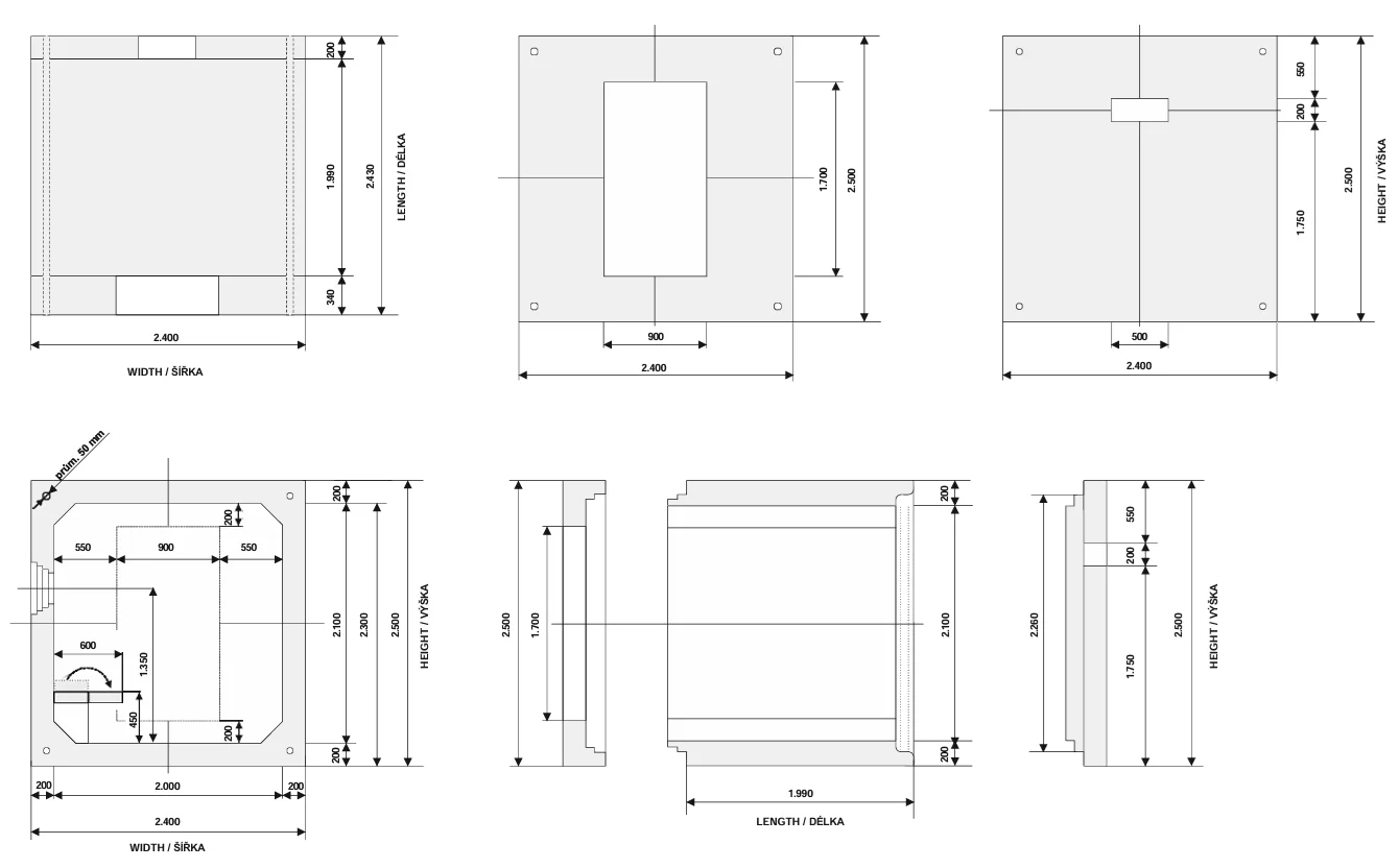 I. Dł. = 2 m, szer.*wys. = 2*2,1 m, całkowita szerokość*wysokość 2,4*2,5 m, grubość ścianki 0,2 m, waga 9,5 t.